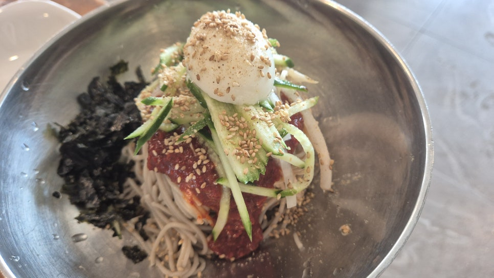 그리고 저는 바로 메밀막국수도 먹었는데, 이게 바로 천상의 맛! 시원하고 깔끔한 국물에 쫄깃한 메밀면이 정말 잘 어울려서 여름에 딱 맞는 한 끼였어요. 이걸 먹으면서 속이 확 풀리는 느낌! 여기에 만두까지 곁들이니, 이건 뭐 정말… 입이 즐거운 순간 그 자체였어요.